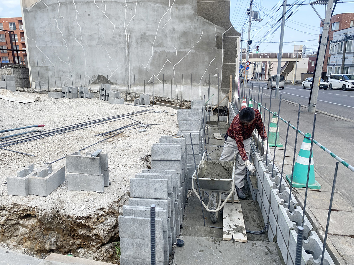 塀や土留めなど、塗り壁にするブロック塀を施工