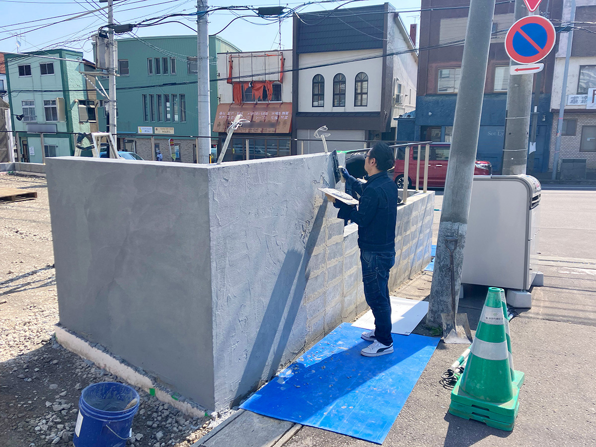 ▲ 塗り壁仕上げ中の様子(CP型枠ブロックに塗壁)