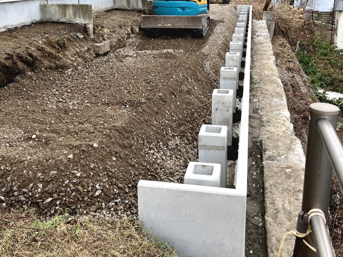 外構工事スタート|古くなった土留めをL型ブロックで新しく施工