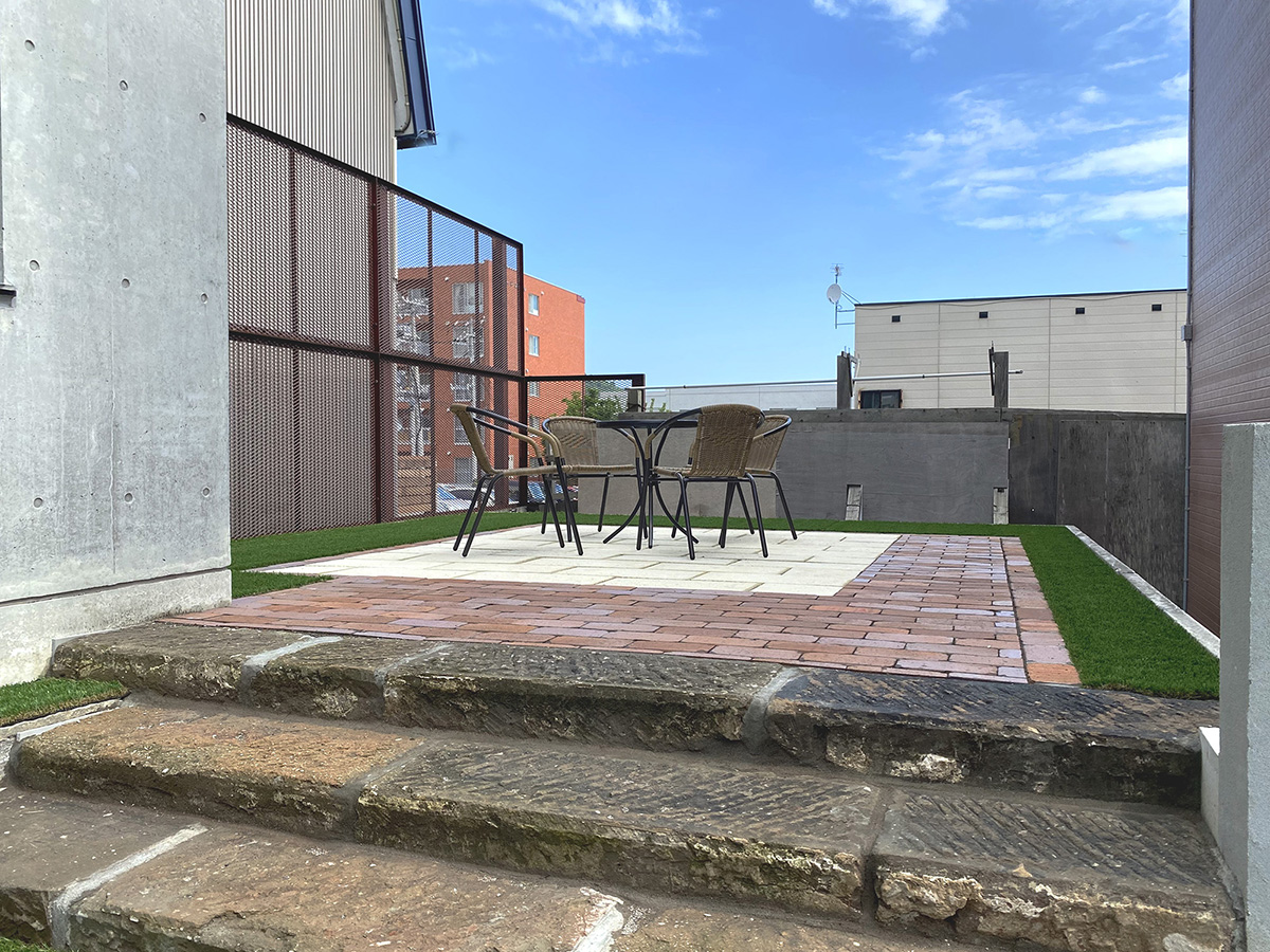単調になりがちなコンクリートに、温かみのあるレンガを加えることで、無機質すぎない優しい印象に仕上げています。また、アプローチを設置することで、視線の抜け感や広がりが生まれ、限られたスペースでも奥行きを感じられるデザインになっています。