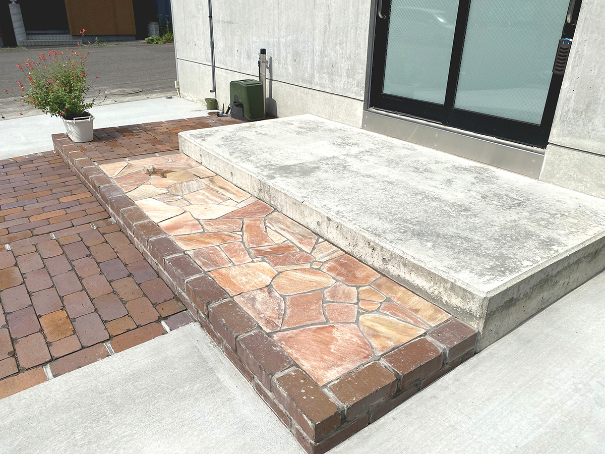 玄関前の高低差には、レンガと乱形石張りでステップを設置