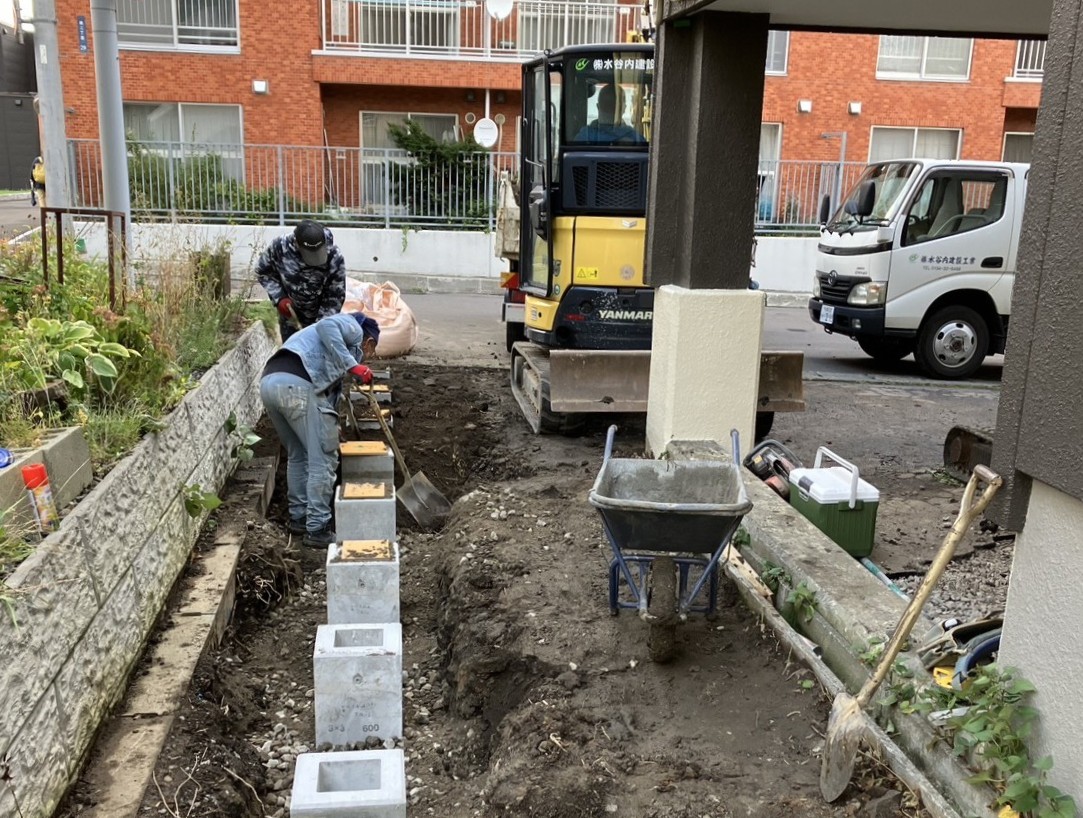 目隠しフェンス設置前の基礎ブロック施工の様子です。