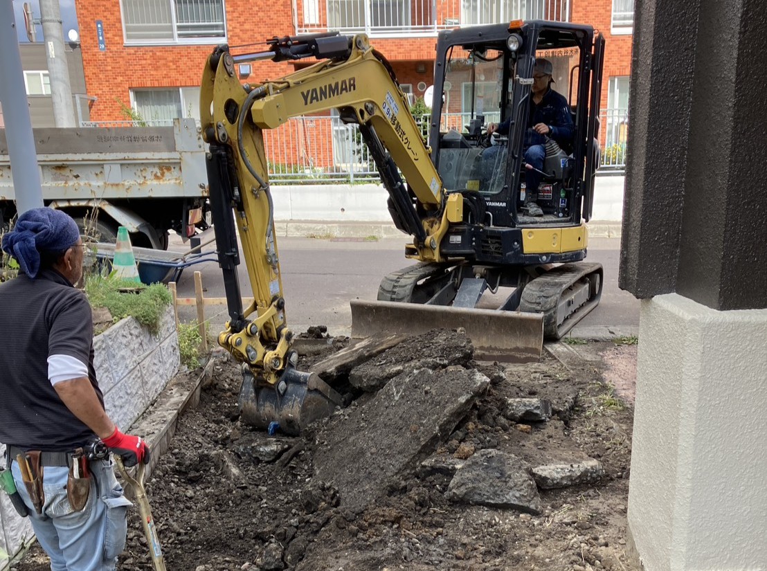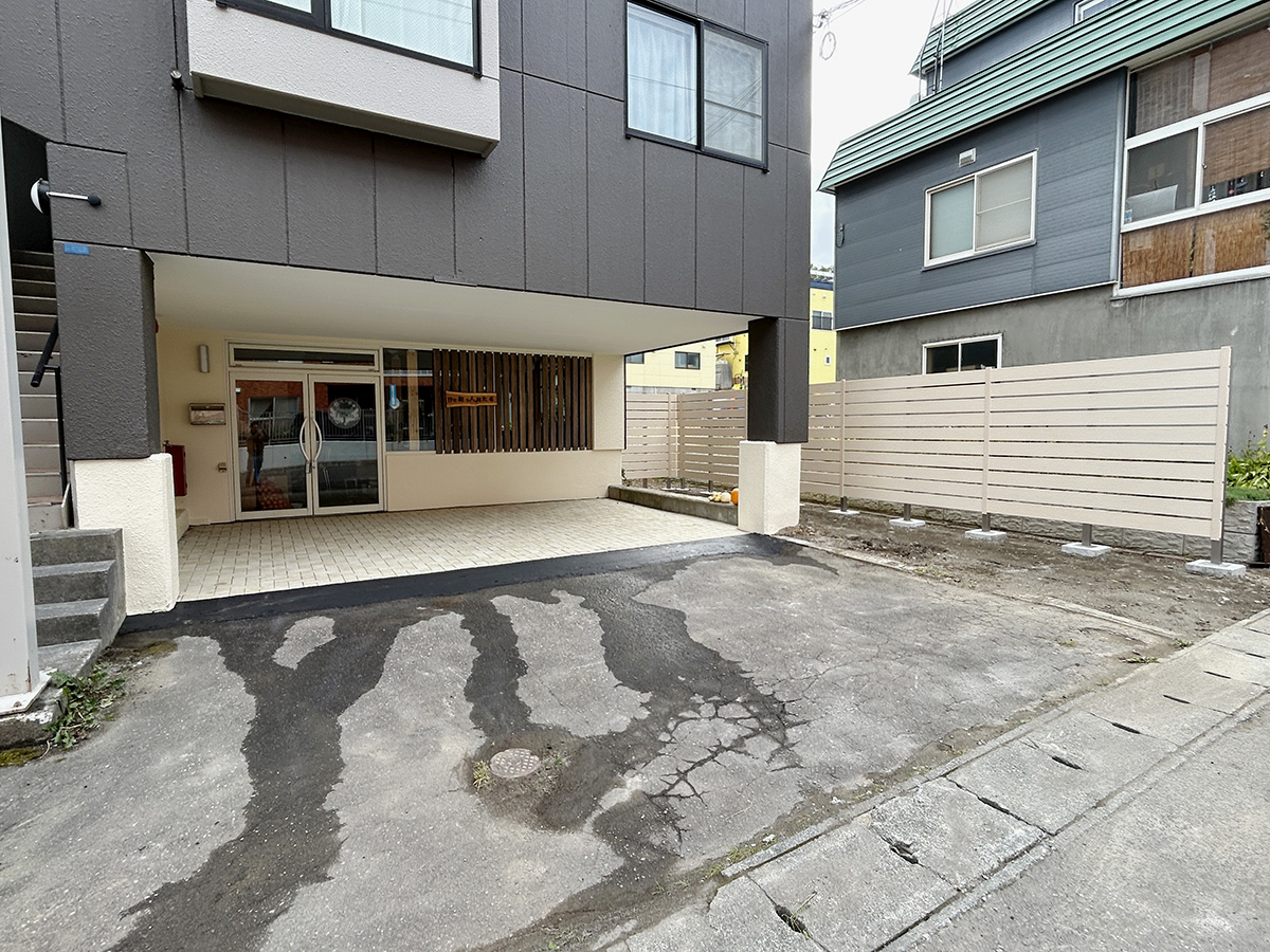 もともとはアスファルト舗装だったスペースでしたが、経年による色あせや汚れが目立ち、少し暗い印象になっていました。