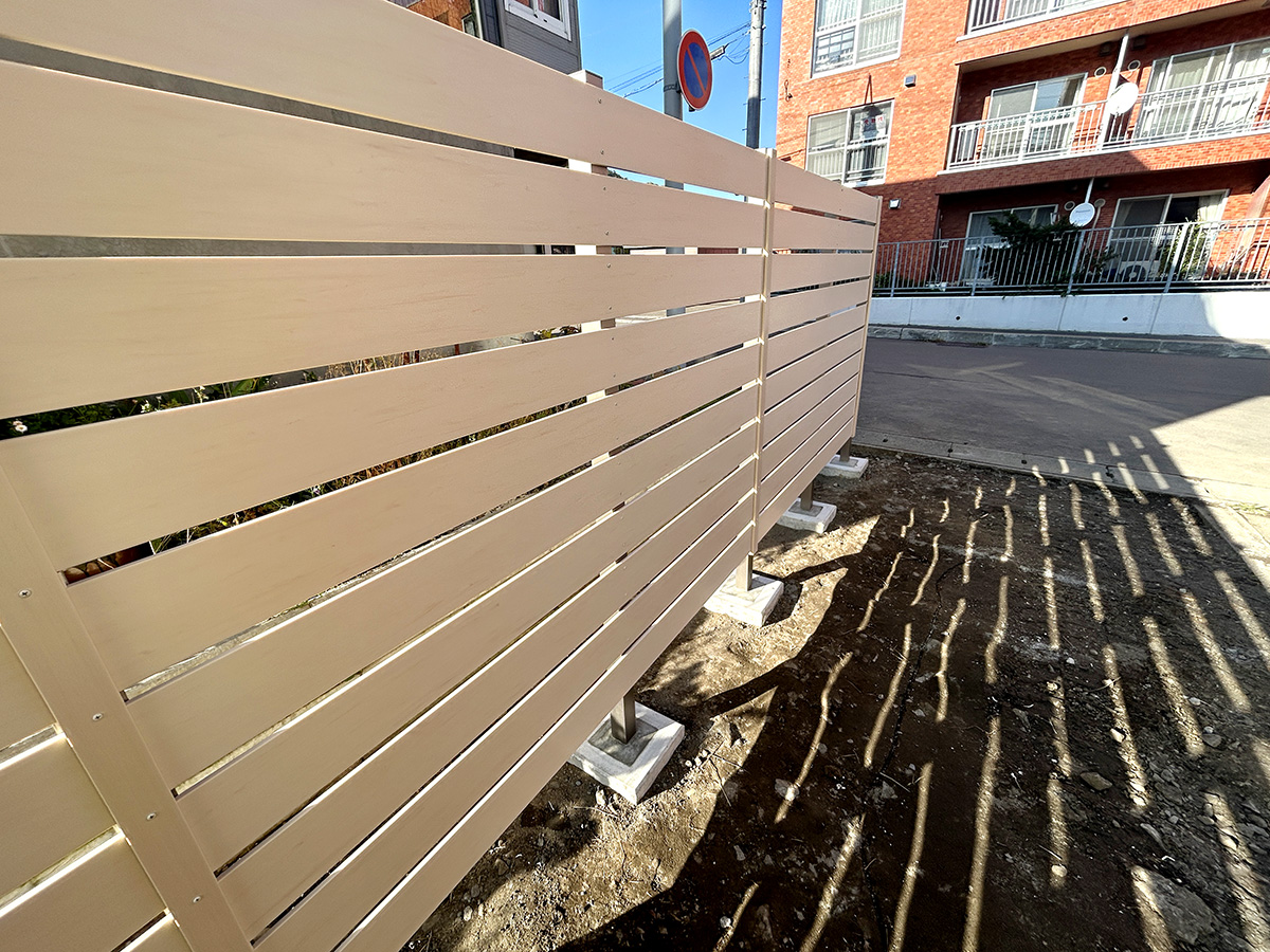 目隠しフェンスは「モクプラボードモダン・ホワイトパイン(タカショー)」を設置。