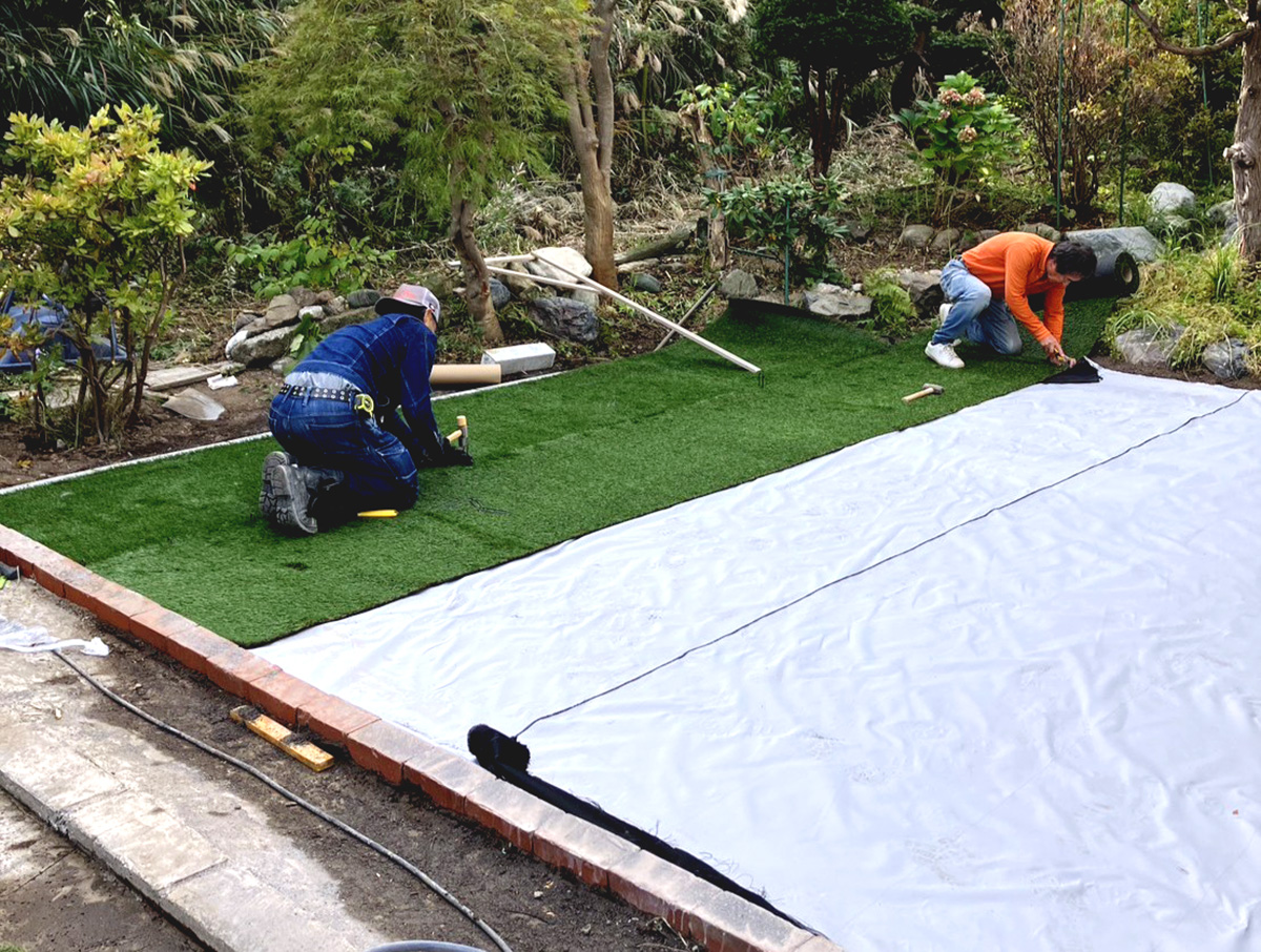 下地調整を行い、防草シートを敷いた上で人工芝を施工。