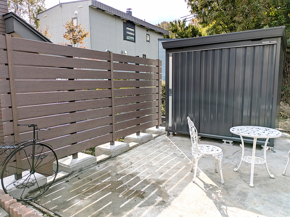 フェンスの内側にはテーブルセットを置けるほどのゆとりがあり、安心してくつろげる空間になりました。