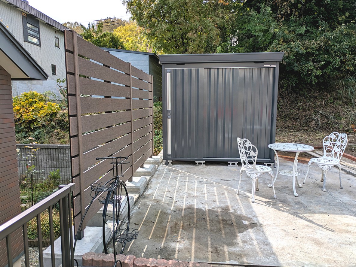 コンクリート舗装のスペースには「落下防止の対策をしたい」、裏庭は「雑草のお手入れを減らして、過ごしやすいお庭にしたい」というご希望をいただき、目隠しフェンスと人工芝の施工を行いました。