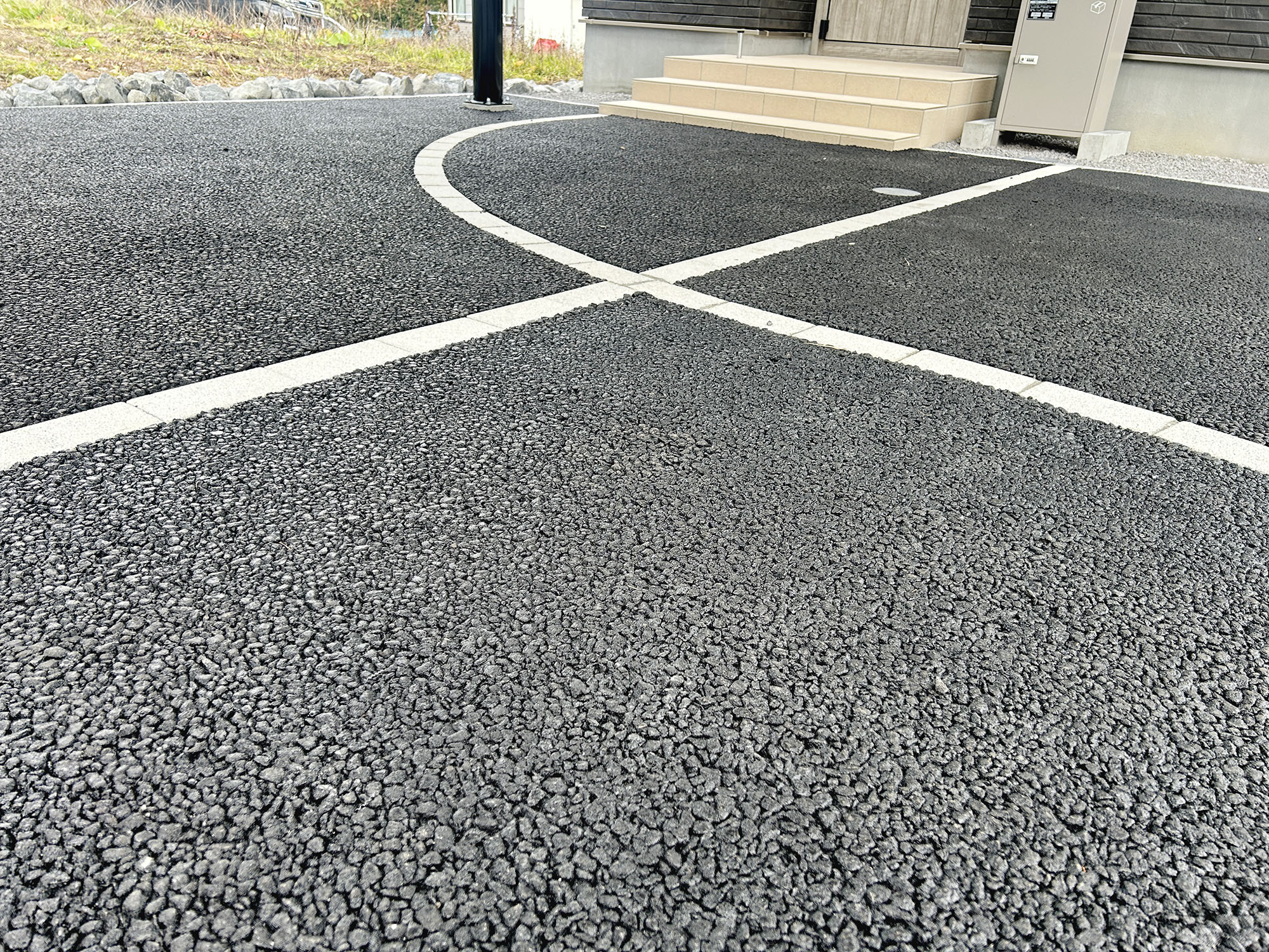 アスファルトと割栗石を組み合わせで、シンプルで落ち着いた雰囲気に仕上げました。